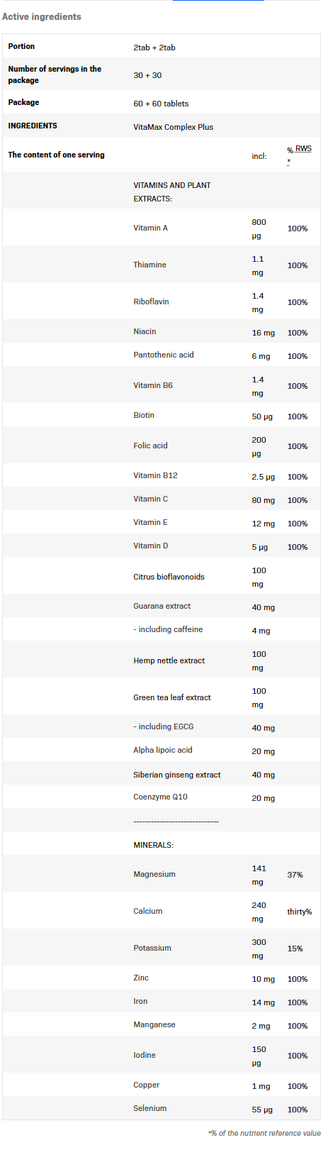 VitaMax Complex Plus е хранителна добавка, предназначена за хора, които искат да допълнят диетата си с витамини, растителни екстракти и минерали. VitaMax Complex Plus благоприятства поддържането на добро здраве и благополучие. Тази хранителна добвка е предназначен за хора, чиято ежедневна диета изисква добавки с витамини и минерали, включително тези, които са физически активни и практикуват спорт. SFD VitaMax Complex Plus съдържа всички най-важни витамини и минерали, с дефицита на които тялото ни може да се бори. Начин на употреба: Приемайте 2 таблетки дневно от формула с Витамини и Натурални Растителни Екстракти и 2 таблетки дневно от формула с Минерали.