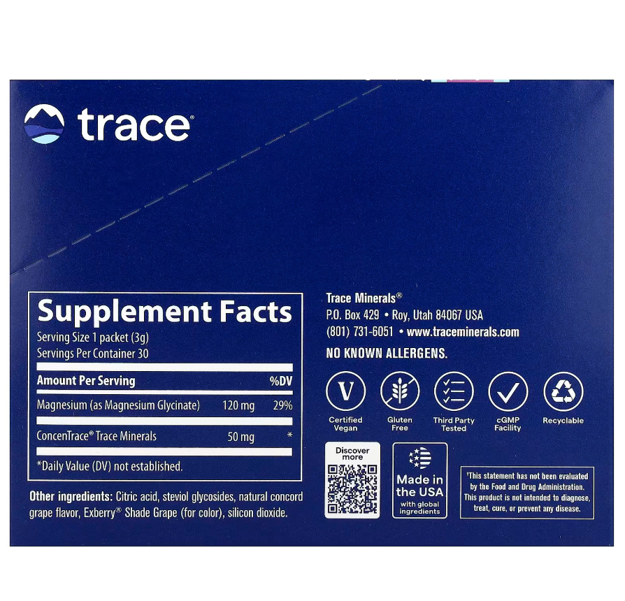 - Съдържа 120 mg магнезий глицинат и 50 mg ConcenTrace® минерали