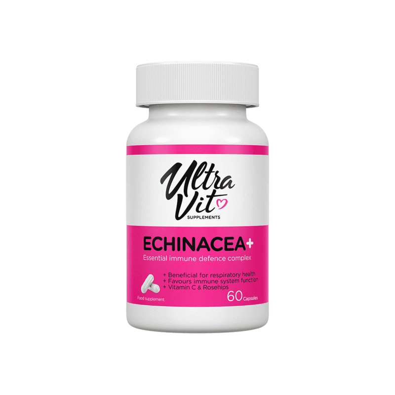 Ехинацеята е ефективното растение с редица ползи за здравето, поради което често се използва за борба с грипа и настинките. UltraVit Echinacea+ е създаден, за да бъде най-ефективната формула на естествена основа, която е подсилена с витамин С и екстракт от шипки, което гарантира по-ефективно и синергично действие. Формулата UltraVit Echinacea+ подобрява имунната система, има антивирусни свойства, както и противовъзпалително.